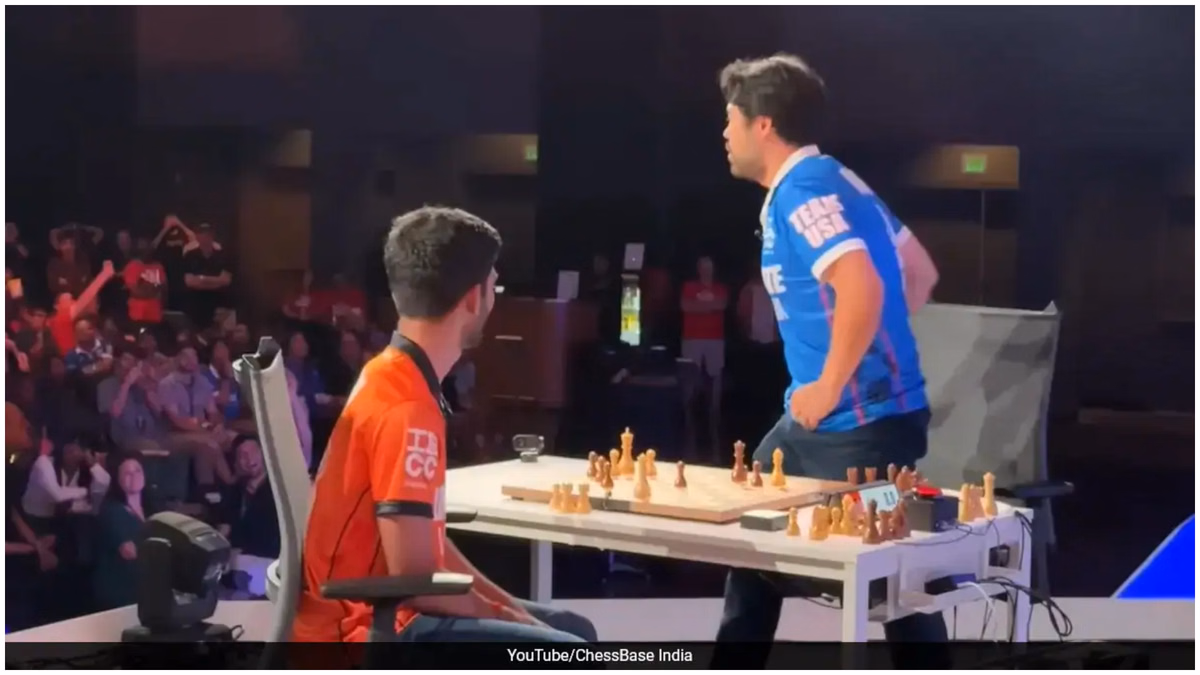 ટેક્સાસના આર્લિંગ્ટનમાં યોજાયેલી પ્રથમ “ચેકમેટ: યુએસએ vs. ઈન્ડિયા” ચેસ સ્પર્ધા દરમિયાન એક અણધારી ઘટના બનેલી. વિશ્વભરના ચેસ ચાહકોને આશ્ચર્યમાં મૂકતી આ ઘટનામાં, અમેરિકન ગ્રાન્ડમાસ્ટર હિકારુ નાકામુરાએ ભારતના વિશ્વ ચેમ્પિયન ડી. ગુકેશને હરાવ્યા બાદ તેમના રાજાને ઉપાડી પ્રેક્ષકોમાં ફેંકી દીધો.